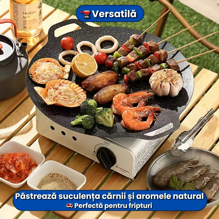 - 🍳 Plita japoneză de 32 cm este ideală pentru gătit uniform, rapid și fără ulei în exces.